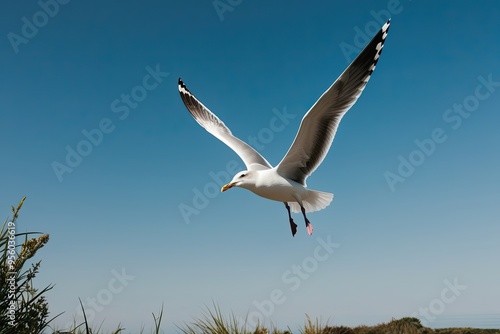 Obraz premium Elegant Seagull Soaring in a Clear Blue Sky Amidst Nature's Tranquility