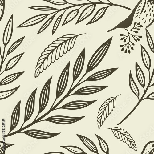 Naklejka premium Elegant seamless pattern with leaves and birds in a naturalistic dark green...