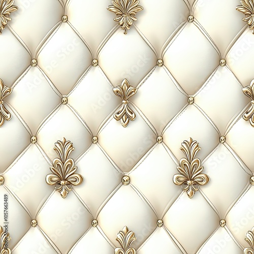 © Adisorn, Obraz premium Elegant seamless White Tufted Leather Pattern with Gold Lily Flower Designs