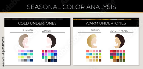 © csiling, Naklejka premium Elegant Seasonal Skin Color Analysis Illustration with Color Swatches and Women Page