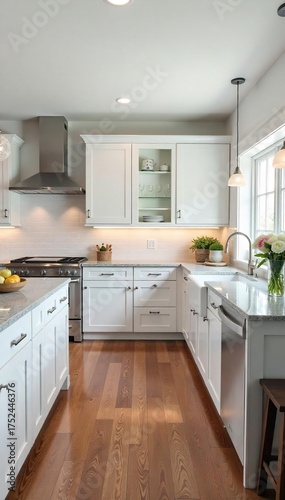 © Pawadee, Fototapeta premium Elegant Shaker Kitchen Design White Cabinets, Granite Countertops, Ample Island Workspace