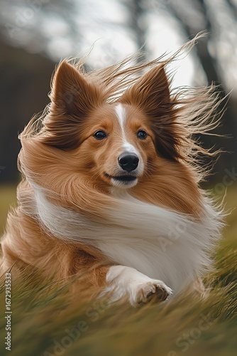 © K teo, Naklejka premium Elegant Shetland Sheepdog with Flowing Fur in the Wind
