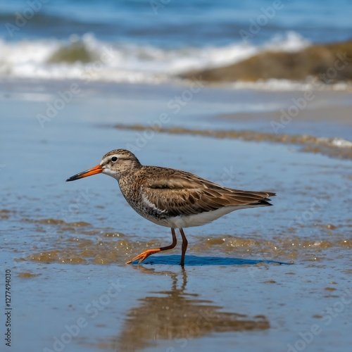 © AmuvitaGamage, Obraz premium Elegant Shorebird Soaring Above Tide Pools, Set Against a Vibrant Blue Sky