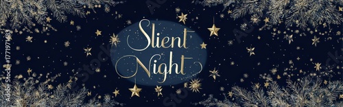 Fototapeta premium Elegant Silent Night Christmas background with golden stars and pine branches on dark blue backdrop Festive holiday season design with a magical, peaceful, and serene mood