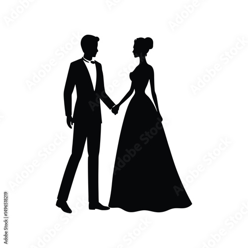 © shahin, Fototapeta premium Elegant silhouette of bride and groom holding hands on their wedding day