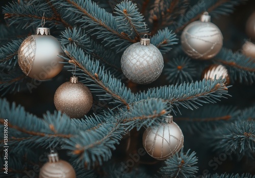 © Jeeranun, Fototapeta premium Elegant Silver Christmas Ornaments on a Evergreen Tree Branch