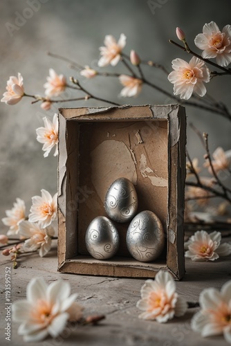 Fototapeta premium Elegant Silver Easter Eggs in Rustic Box with Spring Blossoms