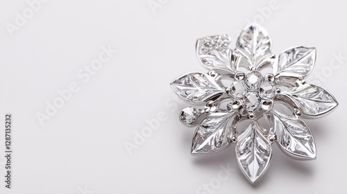© Napasnan, Naklejka premium Elegant Silver Flower Brooch with Crystal Accents on White Background
