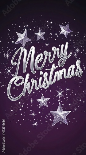 © eye-catching, Fototapeta premium Elegant silver "Merry Christmas" with shimmering stars on a deep purple background, adding a festive touch.