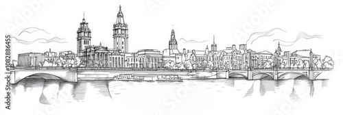 © AI Photo Stock, Obraz premium Elegant single-line drawing of Dublin, Ireland cityscape, featuring iconic buildings, bridges, and river Liffey. Captures architecture, city, travel, and art.