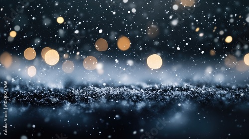 © AugmentArt, Naklejka premium Elegant snowy night backdrop showcasing a delicate black texture with falling snowflakes bokeh lights and a subtle blizzard effect ideal for capturing a cozy winter ambiance