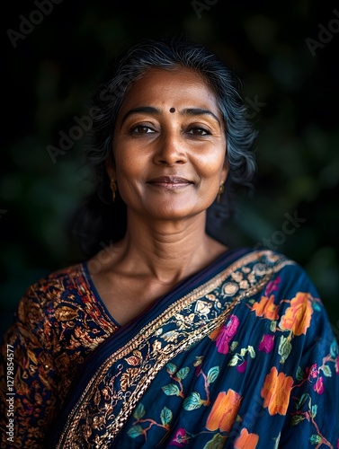 © Stock Journey, Fototapeta premium Elegant South Indian Woman In Floral Saree Portrait