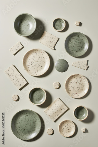 © Olena Liulko, Fototapeta premium Elegant speckled dinnerware arranged artistically on a neutral backdrop showcasing various sizes and shapes of plates and bowls