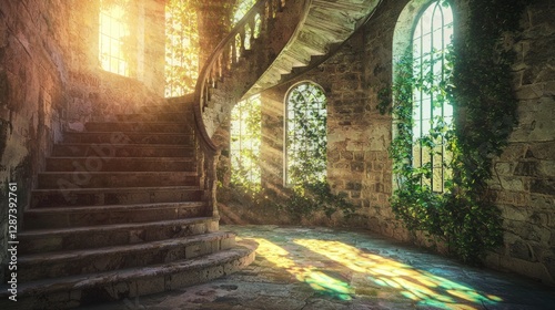 © Jakkarin, Obraz premium Elegant Spiral Staircase in a Sunlit Vintage Interior Space