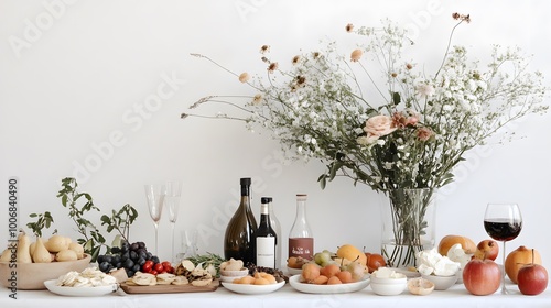 © QITIAN, Fototapeta premium Elegant spread of fruits, cheese, and wine with fresh flowers as a centerpiece.