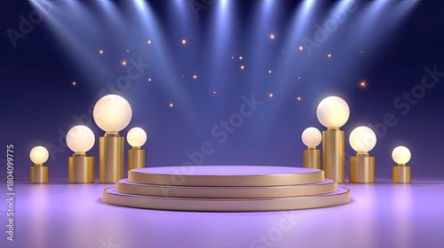 Obraz premium Elegant stage with glowing spheres under dramatic lights, perfect for...