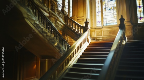 © arhendrix, Obraz premium Elegant staircase in a grand mansion with ornate wooden railings and large stained glass windows, bathed in warm natural light.