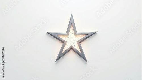 © AiPhotoSale, Obraz premium Elegant star-shaped light fixture in an intimate indoor setting; five elegant gray points radiate from a pristine white core, casting a warm glow against a plain white wall