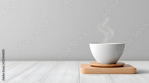 Fototapeta premium Elegant steam rises from a delicate cup of pour-over Burundi coffee, presented on a wooden coaster, inviting a moment of simple, aromatic pleasure and calm.