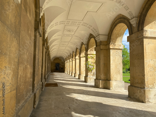 © Rina Tikhomirova, Naklejka premium Elegant stone archway corridor in historic building. Sunlit arches open to lush garden. Vaulted ceiling with ornate details. Peaceful, classical architecture with warm tones and shadows