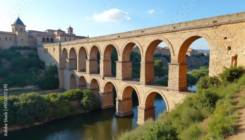 © SwathiFX, Fototapeta premium Elegant stone bridge over serene river