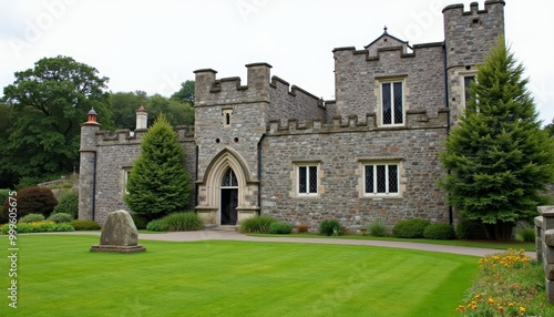 © SwathiFX, Fototapeta premium Elegant Stone Manor with Gracious Gardens
