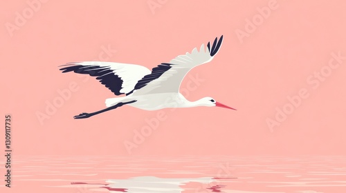 © fajar, Fototapeta premium Elegant stork in graceful flight over a serene rosy ocean landscape