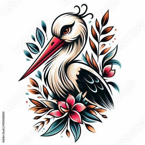 Obraz premium Elegant stork portrait adorned with floral elements in stylized tattoo art