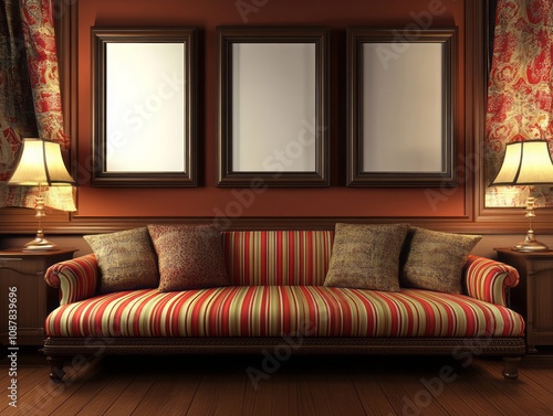 Fototapeta premium Elegant Striped Sofa with Three Empty Frames in a Rich Room