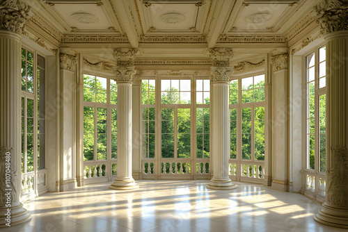 © HQAsset, Obraz premium Elegant Sunlit Classical Room, Grand Architectural Design with Ornate Columns and Expansive Windows Overlooking Lush Greenery
