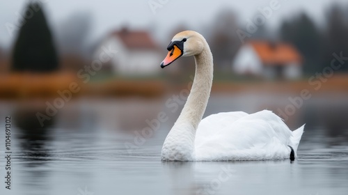 Obraz premium Elegant Swan Gliding on Calm Water with Blurred Background Homes