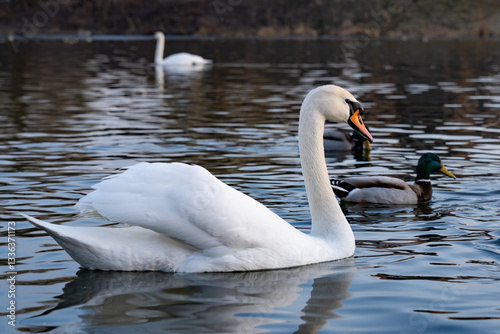 © Serhii, Naklejka premium Elegant swan gliding through calm waters with ducks nearby