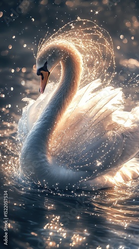 © Saree, Fototapeta premium Elegant swan glimmers in serene water.