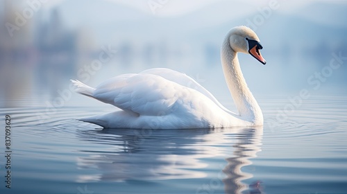 Fototapeta premium Elegant swan on calm lake, smooth glide, symmetrical reflection, meditative...