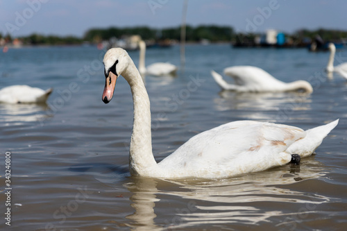 Fototapeta premium Elegant Swan on Danube river with flock of swans in background