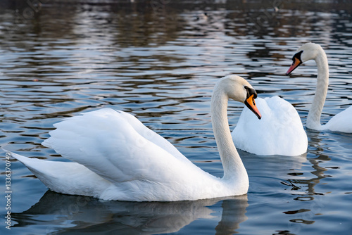 © Serhii, Obraz premium Elegant swans glide gracefully on a calm lake at dawn