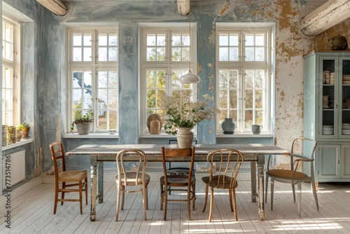 Obraz premium Elegant Swedish dining room with vintage decor and natural light