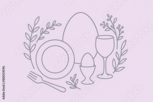 © Leo Rohmann, Obraz premium Elegant table setting featuring a pastel color scheme with plates, utensils, eggs, and greenery illustrating simplicity in modern dining aesthetics