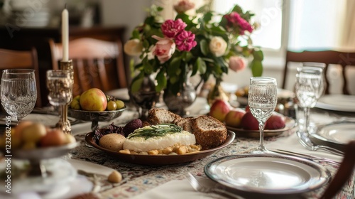 © paryati, Naklejka premium Elegant Table Setting with Cheese, Bread, and Fruit
