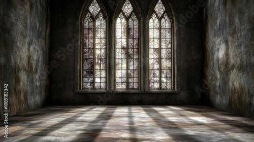 Fototapeta premium Elegant tall stained glass window in a vintage room, intricate patterns, sunlight streaming through, and ample copy space