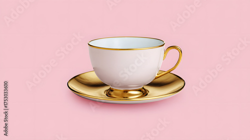 Fototapeta premium Elegant tea cup on a gold-rimmed saucer, center aligned with empty pastel...
