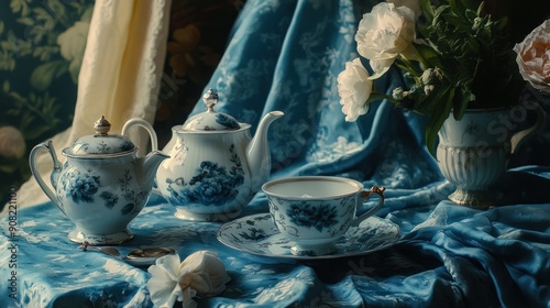 © hanafi 99d, Fototapeta premium Elegant Tea Set and Flowers on a Blue Tablecloth