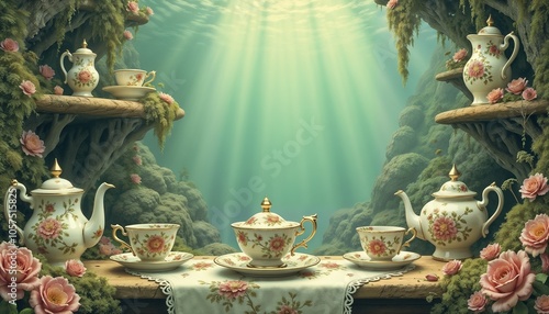 Fototapeta premium Elegant Tea Set in Enchanted Underwater Garden