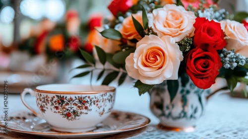 © Yaowarat, Fototapeta premium Elegant Teacup with Floral Arrangement in Soft Natural Light