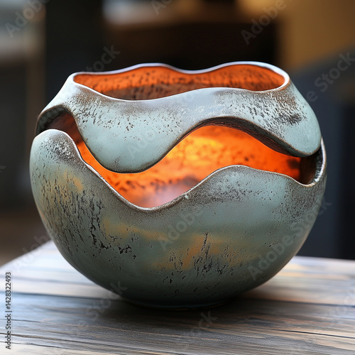 © Yeager Arts, Obraz premium Elegant teal ceramic bowl glowing warm light rustic wood background handcrafted artisan pottery