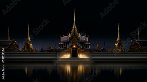 © สรศักดิ์ ธรรมวงษ์ษา, Naklejka premium Elegant Temple Facade with Ornate Golden Architecture Reflected in Still Water at Night