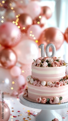 Fototapeta premium Elegant 10th birthday cake with pink roses and balloons for celebratory events