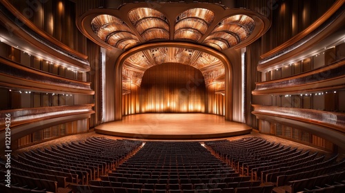 © Katavudh, Fototapeta premium Elegant theater interior featuring seats and grand stage design.
