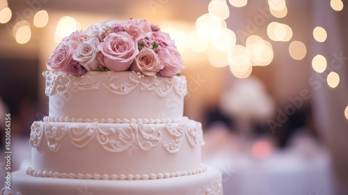 © RATAN, Fototapeta premium Elegant three-tier wedding cake adorned with soft pink roses and intricate royal icing details, glowing softly.