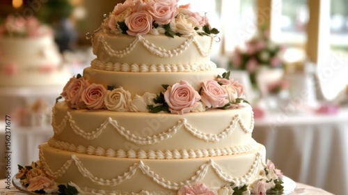 Fototapeta premium Elegant tiered wedding cake adorned with roses